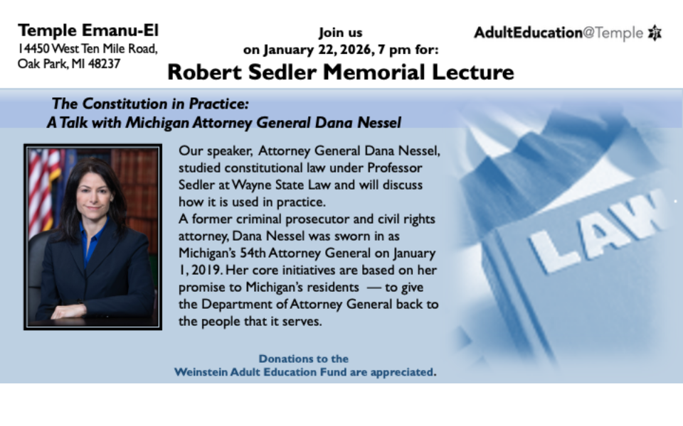 _Join the Adult Education Committee at Temple Emanu-El for…_ **The Constitution in Practice:****A Talk with Michigan Attorney General Dana Nessel**** _A Robert Sedler Memorial Lecture_****When:** Jan 22, 2026 | 7:00 […] |
