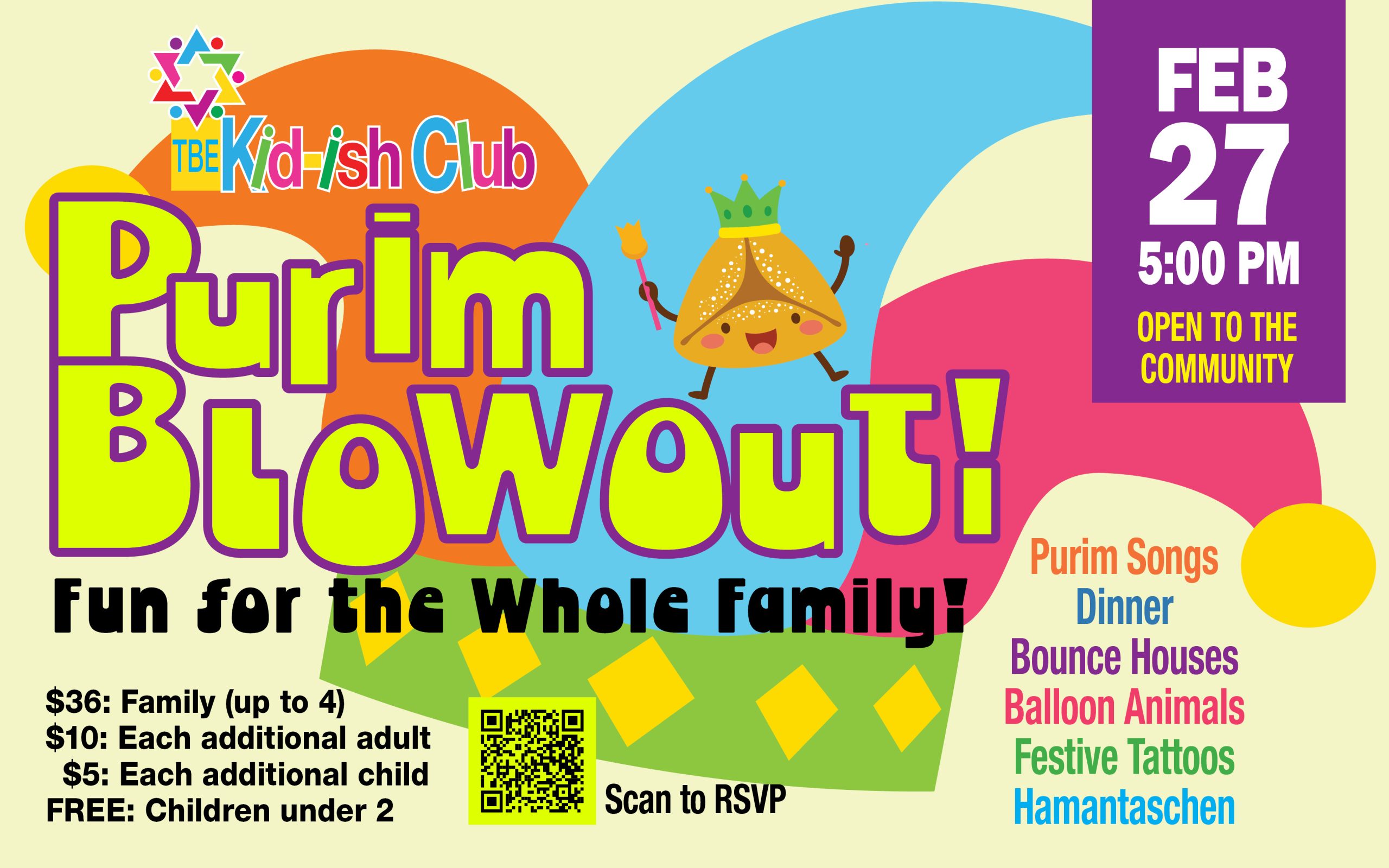 **FRIDAY, FEBRUARY 27****5:00 PM****KID-ISH CLUB PURIM BLOWOUT!** **Dust off your crowns, capes, and costumes — it’s time for the most festive,fun-filled night of the year!** Join us at TBE for […] |